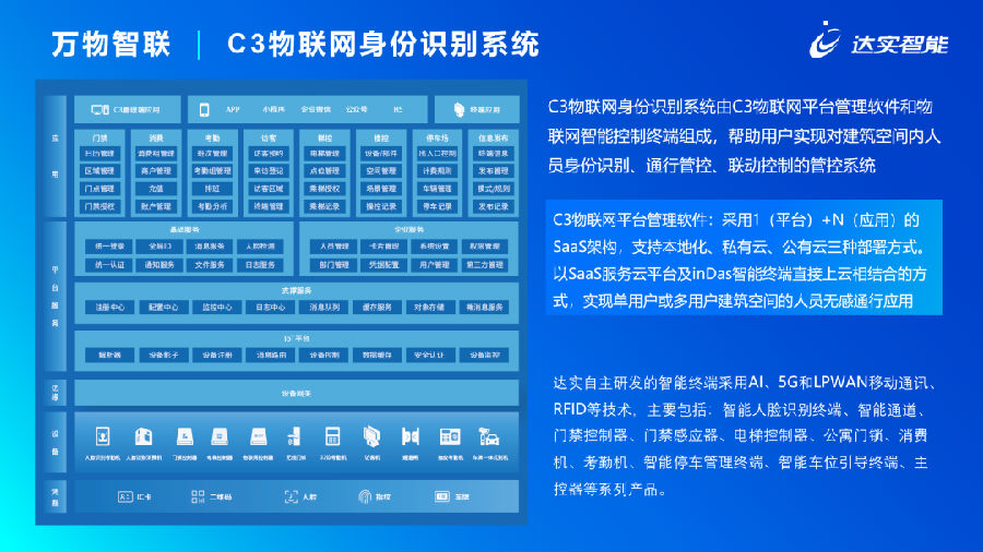 達(dá)實(shí)結(jié)合現(xiàn)場(chǎng)管理需求,為項(xiàng)目提供IBMS綜合管理平臺(tái)和統(tǒng)一的物聯(lián)網(wǎng)身份認(rèn)證平臺(tái),同時(shí)增強(qiáng)平臺(tái)間互聯(lián)互通、交互式體驗(yàn);為大樓綜合運(yùn)維管理、人員身份認(rèn)證提供了可靠的保障、便捷的體驗(yàn)和統(tǒng)一的入口。項(xiàng)目共采用了達(dá)實(shí)門禁系統(tǒng)220套,訪客系統(tǒng)8套、達(dá)實(shí)一卡通管理平臺(tái)1套、達(dá)實(shí)AIOT智慧園區(qū)綜合管理系統(tǒng)1套。