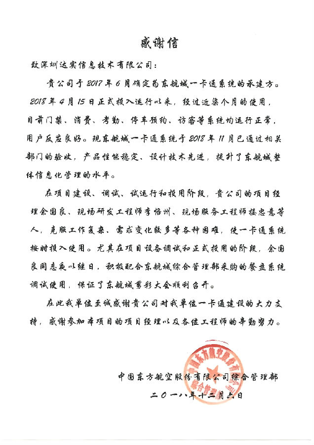 C3物聯(lián)網(wǎng)身份認(rèn)證系統(tǒng)已在東航企業(yè)穩(wěn)定運(yùn)行超過5年,期間不斷增補(bǔ)新產(chǎn)品、服務(wù)蔓延至全國(guó)各基地,經(jīng)受著11萬東航人對(duì)我們的檢驗(yàn)。從員工上下班的日常工作生活,到福利政策的便利實(shí)施,系統(tǒng)已獲得來自東航員工的好評(píng)。早在18年我們就已經(jīng)收到了來自東航企業(yè)的感謝信,這封感謝信也是對(duì)達(dá)實(shí)物聯(lián)20余年開發(fā)經(jīng)驗(yàn)的肯定。
