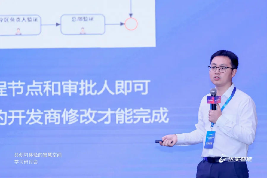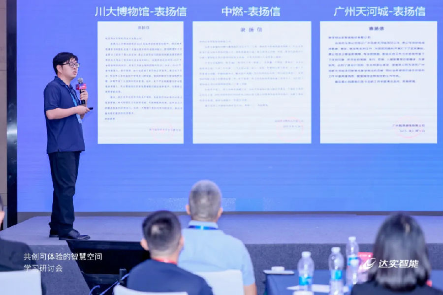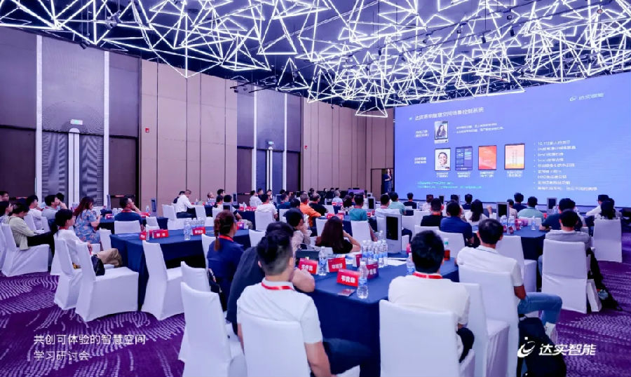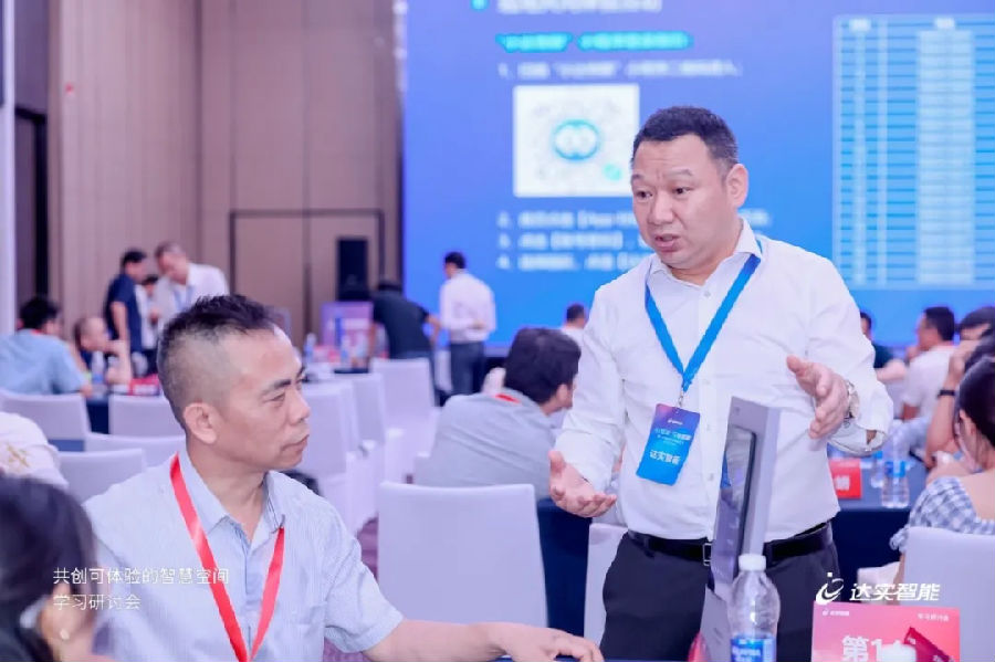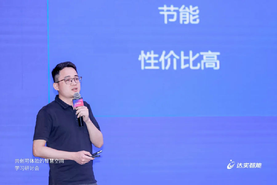達(dá)實物聯(lián)空間場景產(chǎn)品經(jīng)理何榮聰分享了《如何運用達(dá)實空間場景系統(tǒng)打造智慧辦公空間》的主題演講。達(dá)實空間場景控制系統(tǒng)是達(dá)實自主研發(fā),適用于智慧建筑空間單元場景化控制的創(chuàng)新產(chǎn)品,具備易設(shè)計、易安裝、易拓展等系統(tǒng)優(yōu)勢。據(jù)何榮聰介紹,系統(tǒng)以會議室、辦公室、開放辦公區(qū)等空間作為單元,利用核心產(chǎn)品“空間場景交互屏”作為邊緣網(wǎng)關(guān),上接云平臺,下接空間內(nèi)門禁、燈光、窗簾、空調(diào)等終端設(shè)備集成于“空間場景控制器”,實現(xiàn)單元空間內(nèi)設(shè)備的互聯(lián)互通,既能做到場景交互,也能實現(xiàn)對單元空間內(nèi)設(shè)備的便捷控制,能夠幫助企業(yè)提升工作效率與企業(yè)形象。
