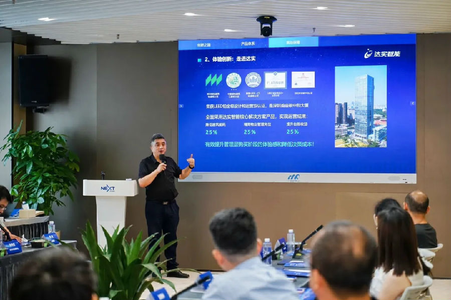會(huì)上,達(dá)實(shí)物聯(lián)市場(chǎng)總監(jiān)黃志勇受邀作達(dá)實(shí)物聯(lián)網(wǎng)產(chǎn)品以用戶(hù)為中心的創(chuàng)新應(yīng)用與未來(lái)展望”主題演講。與業(yè)內(nèi)大咖分享達(dá)實(shí)1個(gè)平臺(tái)+8大系統(tǒng)的整體架構(gòu):基于自主研發(fā)的AIoT智能物聯(lián)網(wǎng)管控平臺(tái),從大屏端、物業(yè)端、手機(jī)端到墻上的設(shè)備端,提供空間場(chǎng)景、智慧人行、智慧車(chē)行、智慧餐廳、信息發(fā)布、設(shè)備場(chǎng)景、能耗監(jiān)測(cè)、節(jié)能管控等智慧化的場(chǎng)景服務(wù)。