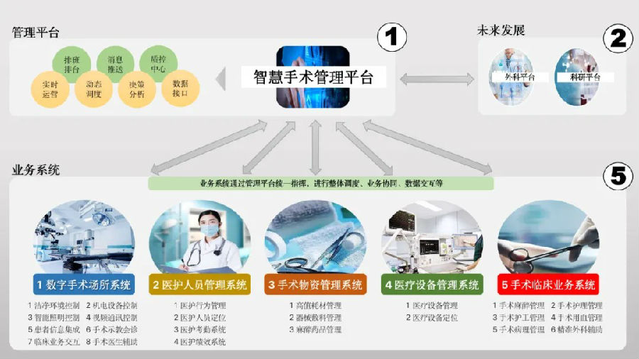 五大系統(tǒng)涵蓋了圍術(shù)期整個(gè)運(yùn)轉(zhuǎn),通過(guò)統(tǒng)一的智慧手術(shù)管理平臺(tái)實(shí)現(xiàn)統(tǒng)一的任務(wù)發(fā)布(排班、排臺(tái))、消息推送(流轉(zhuǎn)信息統(tǒng)一處理)、質(zhì)控中心(動(dòng)態(tài)監(jiān)測(cè)手術(shù)質(zhì)控)、實(shí)時(shí)運(yùn)營(yíng)(整體調(diào)度手術(shù)進(jìn)展、5大系統(tǒng)業(yè)務(wù)協(xié)同)、決策分析(通過(guò)大量手術(shù)運(yùn)行數(shù)據(jù)進(jìn)行分析,輔助管理者決策)、數(shù)據(jù)接口(所有信息系統(tǒng)、物聯(lián)網(wǎng)系統(tǒng)的數(shù)據(jù)統(tǒng)一管控,與院區(qū)互聯(lián)互通),最終形成圍術(shù)期的全程分析。
