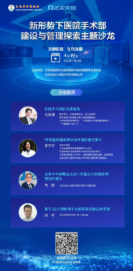 4月19日 13:30-16:30,達實智能旗下全資子公司達實久信聯(lián)合江蘇省醫(yī)院協(xié)會醫(yī)院建筑與規(guī)劃管理專業(yè)委員會,邀請十多位相關醫(yī)療領域的專家、大咖,共同舉辦醫(yī)療行業(yè)主題沙龍:【新形勢下醫(yī)院手術(shù)部建設與管理探索】,與大家共同探索醫(yī)院手術(shù)部建設的當下與未來。