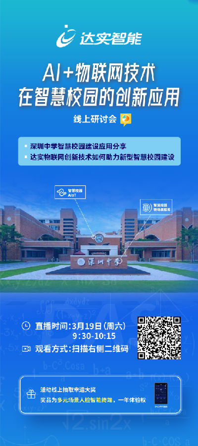 為加快推進學校教育現代化,為廣大師生提供更加優(yōu)質、便捷和高效的服務,3月19日,達實將舉行“AI+物聯網技術在智慧校園的創(chuàng)新應用線上研討會”,以期為學校管理者帶來前沿智慧與啟迪。