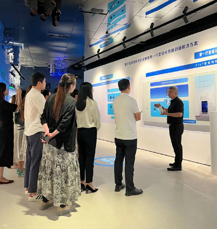 達(dá)實(shí)大廈作為國內(nèi)首座獲得“雙標(biāo)準(zhǔn)、三認(rèn)證”的綠色智慧大廈,采用了大量的AI+物聯(lián)網(wǎng)技術(shù),是近年來在智慧化物聯(lián)網(wǎng)技術(shù)應(yīng)用的最新典范之作。在達(dá)實(shí)大廈,嘉賓們切實(shí)體驗(yàn)到了全過程的智慧辦公之旅,真正感受到了科技創(chuàng)新帶來的高效與便捷。達(dá)實(shí)大廈辦公場所遵循“無實(shí)體按鍵”設(shè)計(jì),一臺(tái)手機(jī),一個(gè)APP,智聯(lián)大樓所有設(shè)備,空調(diào)、窗簾、電梯、燈光的控制。通過辦公室門禁進(jìn)入辦公區(qū)域時(shí),系統(tǒng)通過人體智能感應(yīng),開啟智慧辦公場景,同時(shí)員工可以通過情景面板、手機(jī)APP或語音控制燈光、窗簾及空調(diào)等全場景智慧控制。