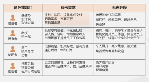 通常我們講“以客戶為中心,看客戶的需求”,我們通常只看第一行、第一列的客戶需求。第一行是采購產(chǎn)品和服務(wù)的部門需求,第一列是他有形的需求。但我們不應(yīng)該只看到這個大樓智能化采購者的有形需求,還要看到他們的無形需求,還要看到樓里邊的物業(yè)管理、辦公人員,甚至是訪客的有形需求和無形需求。有了這個,再加上對客戶的深度、廣泛洞察,我們自然就能創(chuàng)新出解決方案。通常的智能化解決方案,只服務(wù)于少數(shù)物業(yè)、設(shè)備、機(jī)電、工程師,達(dá)實(shí)服務(wù)了5000個各類最終使用的員工,包括每位到達(dá)實(shí)去的人,實(shí)現(xiàn)了從控制物到服務(wù)人的本質(zhì)變化。以前把一個大廈看作是一個整體的復(fù)雜定制,今天我們透過這個整體,看到里邊幾百個單元空間,我們?yōu)樗麄儎?chuàng)造場景應(yīng)用系統(tǒng),幾百個場景應(yīng)用系統(tǒng)直接上云,顛覆了整個物聯(lián)網(wǎng)技術(shù)在大樓、在產(chǎn)業(yè)園區(qū)應(yīng)用的傳統(tǒng)的架構(gòu)。如此,我們實(shí)現(xiàn)了綠色和智慧。