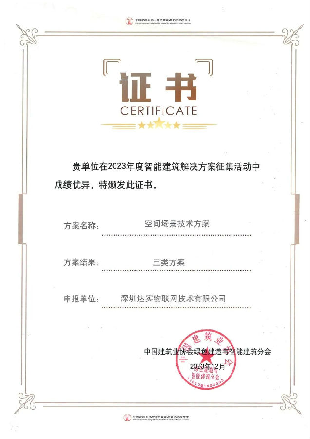 為推進(jìn)建筑工業(yè)化、數(shù)字化、智能化升級(jí),加快建造方式轉(zhuǎn)變,推動(dòng)建筑業(yè)高質(zhì)量發(fā)展,中國建筑業(yè)協(xié)會(huì)綠色建造與智能建筑分會(huì)在業(yè)內(nèi)開展了智能建筑解決方案征集活動(dòng)。達(dá)實(shí)空間場景控制系統(tǒng)解決方案憑借其“強(qiáng)體驗(yàn)、快部署、低成本”的優(yōu)勢從眾多方案中脫穎而出,榮獲優(yōu)秀解決方案獎(jiǎng)!