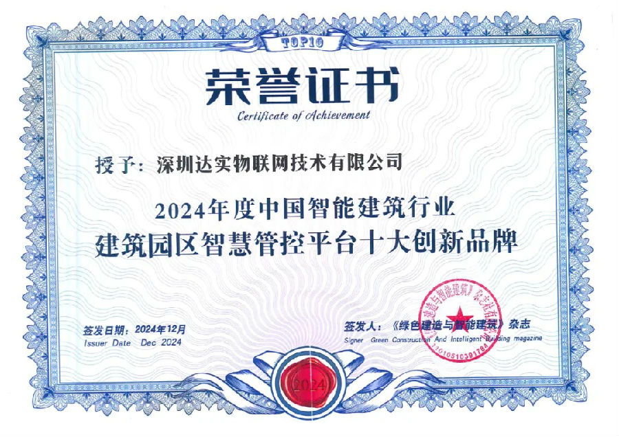 憑借多年來在建筑智能化行業(yè)的探索與實踐、創(chuàng)新與成果,深圳達(dá)實物聯(lián)網(wǎng)技術(shù)有限公司在眾多品牌中脫穎而出,連續(xù)多年榮獲“2024建筑園區(qū)智慧管控平臺十大創(chuàng)新品牌”及“2024智慧安防系統(tǒng)十大匠心產(chǎn)品品牌”兩項大獎。