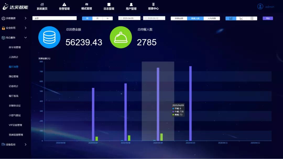 達(dá)實(shí)大廈基于AIOT物聯(lián)網(wǎng)管控平臺(tái)來實(shí)現(xiàn)整棟大廈的全生命周期可視化管理。消費(fèi)環(huán)節(jié)也不會(huì)放過,從食堂的客流到消費(fèi),平臺(tái)分時(shí)份層地管理每一層每一個(gè)檔口的消費(fèi)情況。提供最準(zhǔn)去的數(shù)據(jù),幫助食堂運(yùn)營(yíng)人員合理分配餐品,減少供應(yīng)過剩或供應(yīng)不足的情況。