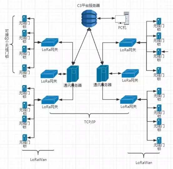 用戶刷卡后,無線門鎖設備先判斷本地是否有權,有權則開門,無權則開啟通訊連接,詢問上位機該卡是否有權,有權則開門,并更新下載黑白名單。無線門鎖系統(tǒng)中每個網關可控制60把無線門鎖,網關與上位機通訊為TCP通訊方式,與門鎖設備為LORA通訊方式。