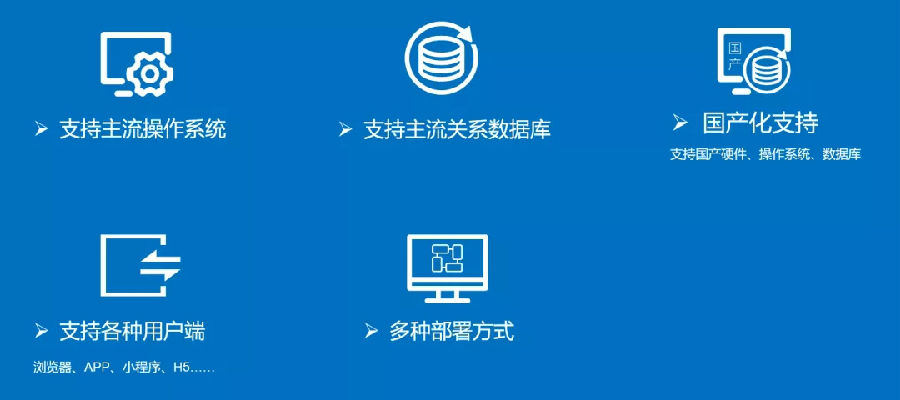 在應(yīng)用環(huán)境方面,支持主流操作系統(tǒng),支持主流關(guān)系數(shù)據(jù)庫(kù),支持國(guó)產(chǎn)硬件、操作系統(tǒng)及數(shù)據(jù)庫(kù),支持APP、小程序等多種用戶(hù)端,同時(shí),支持多種部署方式,包括本地部署、私有云部署、公有云部署及云服務(wù)免部署等。