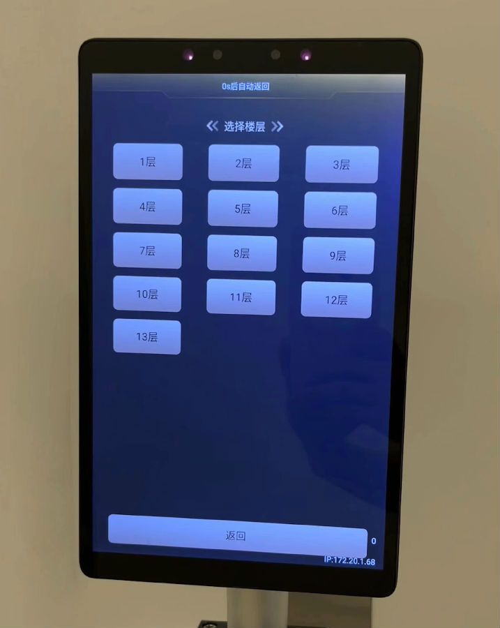 可按用戶權(quán)限進(jìn)行選層派梯,有權(quán)則允許派梯,無權(quán)則不能派梯。權(quán)限認(rèn)證通過后派梯屏跳轉(zhuǎn)到選層界面,供用戶在權(quán)限開放的樓層中選擇需要去往的樓層。然后會將分配的電梯號顯示在平板上,使得用戶可以提前在對應(yīng)電梯門前等待。此外,可設(shè)置固定開放權(quán)限的樓層號在派梯屏首頁,如首層、食堂層等,用戶無需驗(yàn)證權(quán)限便可直接點(diǎn)擊派梯。